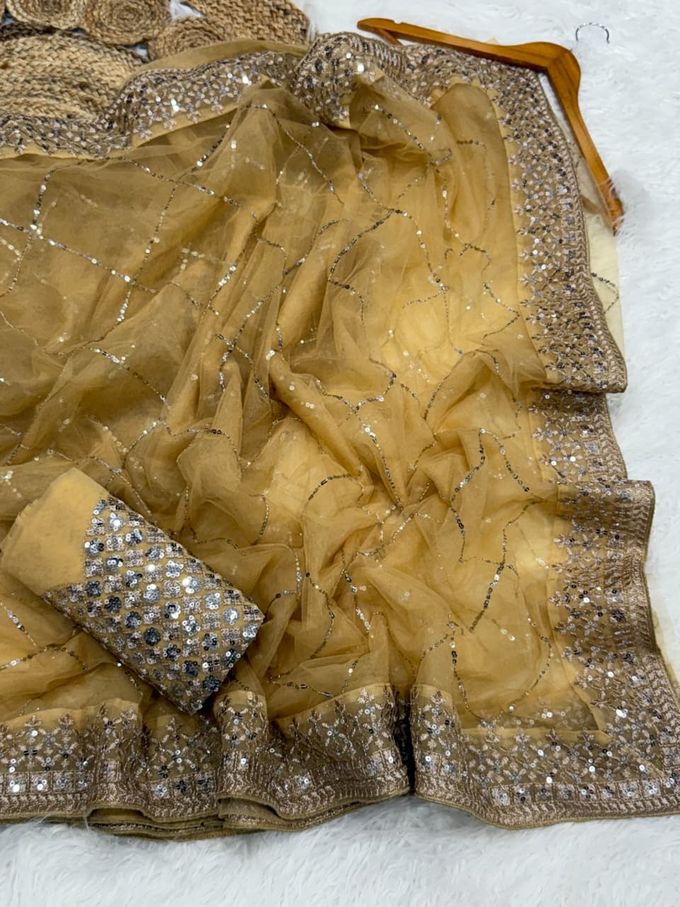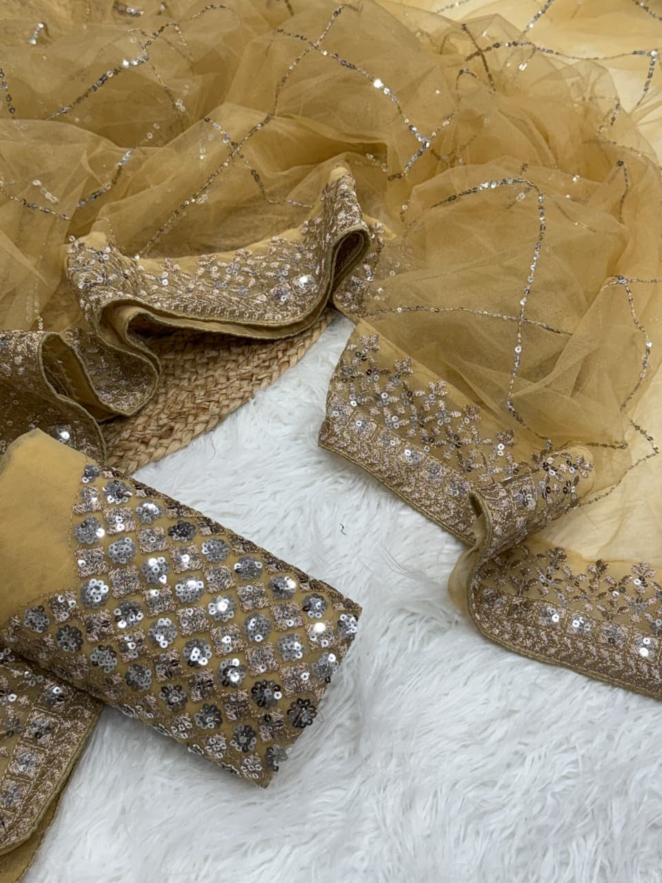 ✨ Adorned with intricate double sequins embroidery (3mm & 5mm) combined with rich zari work, creating a glamorous and eye-catching appeal.